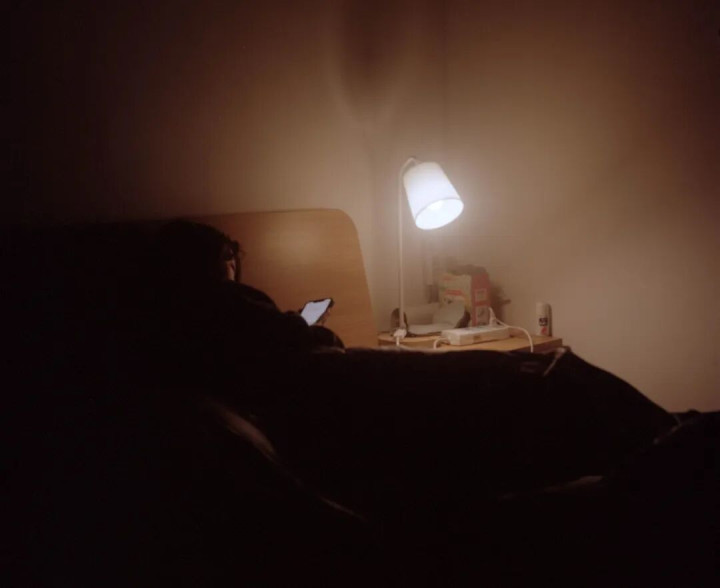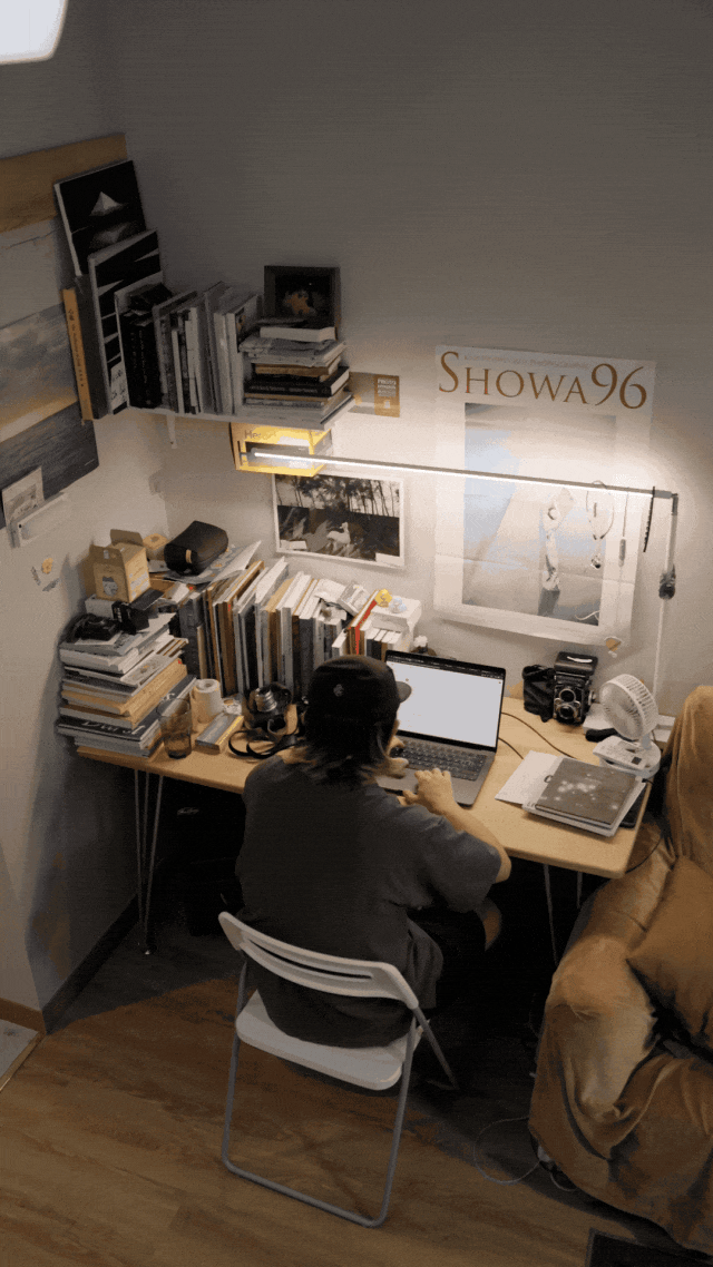 我和他约在了公寓见面,他在深夜里工作,面对着电脑。但我把相机架好,构好图,却迟迟没法拍摄,我不知道为什么。阿辉看到我的困境之后,立马把窗帘拉开,走廊微弱的灯光,就透过绿色的窗户打到了他的墙壁上,那一刻,我毫不犹豫地按下了快门。
